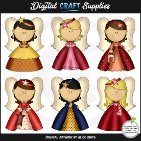 This collection includes six beautiful angels, wearing pretty polka dot dresses, star halos, and beautiful angel wings, a candle lantern, prim stars, and a pretty polka dot heart. Colors include: gold, pumpkin, pink, red, salmon, maroon, and blue. This set contains 6 graphics.