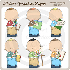 This collection includes little art student boys with paint tubes, paint brushes, sketch paper, a bottle of glue, colored construction paper, a sketch book, colored pencils, a notepad, an art easel, and a paint pallet with paintbrush. This set contains 6 graphics.