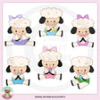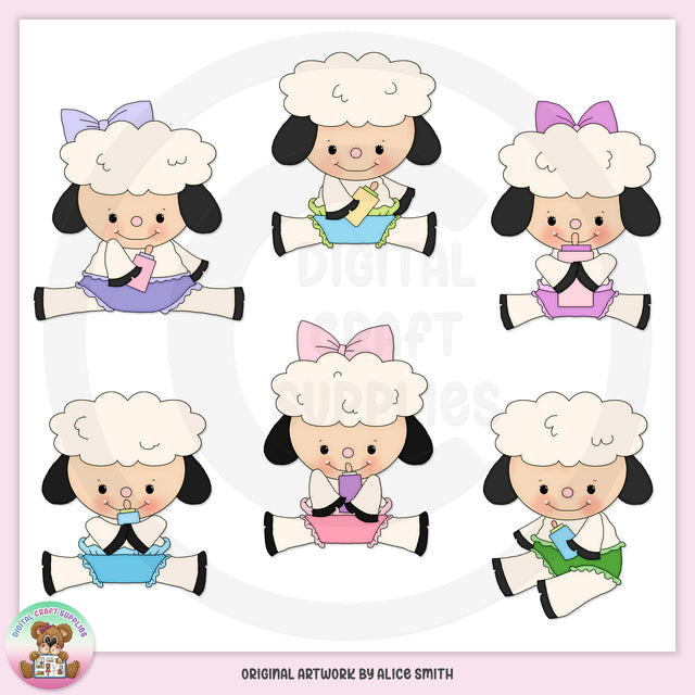 This collection includes three baby girl lambs, with pretty hair bows, diaper covers, and baby bottles, and three baby boy lambs, with diaper covers and baby bottles. This set contains 6 graphics.