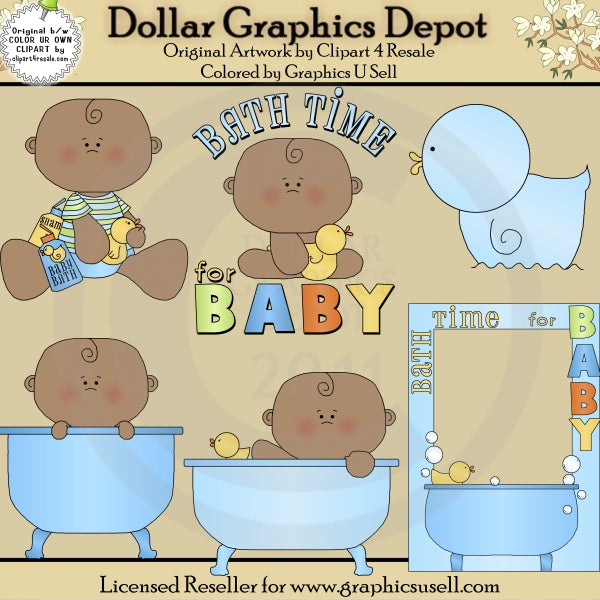 This collection includes two baby boys in bathtubs, one with a rubber duck, a baby boy with a striped t-shirt, diaper cover, baby shampoo, baby bath, and a rubber duck, a large rubber duck, a blue frame with "Bath Time for Baby" word art, a bathtub, rubber duck, and bubbles, and one "Bath Time for Baby" word art graphic. This set contains 6 graphics.