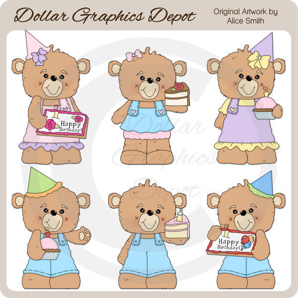 This one-of-a-kind collection is only available at Digital Craft Supplies. This set includes adorable birthday bear girls and boys, with party hats, frosted cupcakes with candles, sliced birthday cake, a boy's birthday cake with balloons and a candle, and a girl's birthday cake with flowers and a candle. This exclusive set contains 6 graphics.