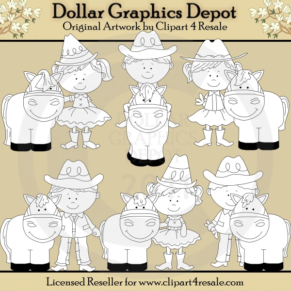 This one-of-a-kind collection is only available at Digital Craft Supplies. This set includes three cowgirls dressed in pretty dresses, cowgirl hats, and cowgirl boots, three cowboys dressed in cowboy hats, cowboy boots, blue jeans, chaps, long sleeve shirts, and vests, feeding carrots, and six adorable little horses. This exclusive set contains 6 digital stamps.