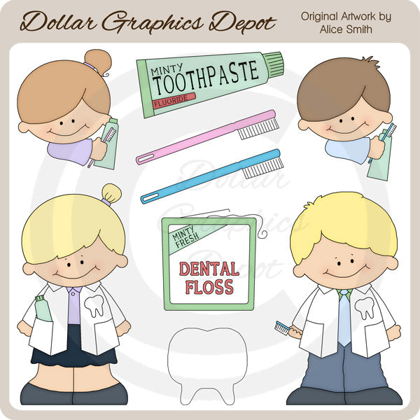 This one-of-a-kind collection is only available at Digital Craft Supplies. This set includes two dentists, a little girl with a toothbrush and toothpaste, a little boy with a toothbrush and toothpaste, a tooth, dental floss, a blue toothbrush, a pink toothbrush, and a tube of toothpaste. This exclusive set contains 9 graphics.
