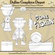 This one-of-a-kind collection is only available at Digital Craft Supplies. This set includes a little boy with a fishing pole, fishing hat, and a bunch of fish, a man with a fishing pole, fishing hat, and a tackle box, a little boy in a fishing boat, with a fishing pole, bait, a can of soda, and a tackle box, a fishing pole with bobber, a tackle box, and one "Gone Fishin" word art graphic. This exclusive set contains 6 digital stamps.