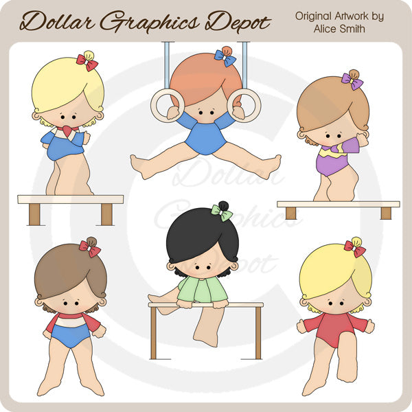 This one-of-a-kind collection is only available at Digital Craft Supplies. This set includes six gymnasts, with colorful leotards and matching hair bows, balance beams and still rings. This exclusive set contains 6 graphics.