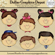 This collection includes three little toddler girl faces, with pretty collars and hair bows in red, pink, blue, and white, and three little toddler boy faces, with handsome blue collars, a necktie, and a hat. This set contains 6 graphics.
