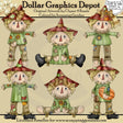 This collection includes five straw stuffed scarecrows, wearing brown pants, green long sleeve shirts, and burnt orange hats, with little patches, sunflowers, and bows, and one pumpkin. This set contains 6 graphics.