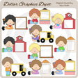 This collection includes adorable little school boys and girls, with school frames in the shapes of schoolhouses, pencils, glue bottles, school buses, and traditional frames with litlte red apples. This set contains 10 graphics.