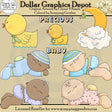 This collection includes four adorable sleeping babies, wearing cute little pajamas, diaper covers, baby hats, and pretty hair bows, a rubber duck, a moon with clouds and a little star, and one "Precious Baby" word art graphic. Colors include: blue, pink, yellow, lavender, and green. This set contains 7 graphics.