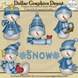This collection includes five sweet little snowmen, dressed in winter coats, hats, scarves, mittens, and ear muffs, little stars, hearts, snowflakes, a birdhouse, and one "Snow" word art graphic. Colors include: blue, white, orange, red, gold, and brown. This set contains 6 graphics.