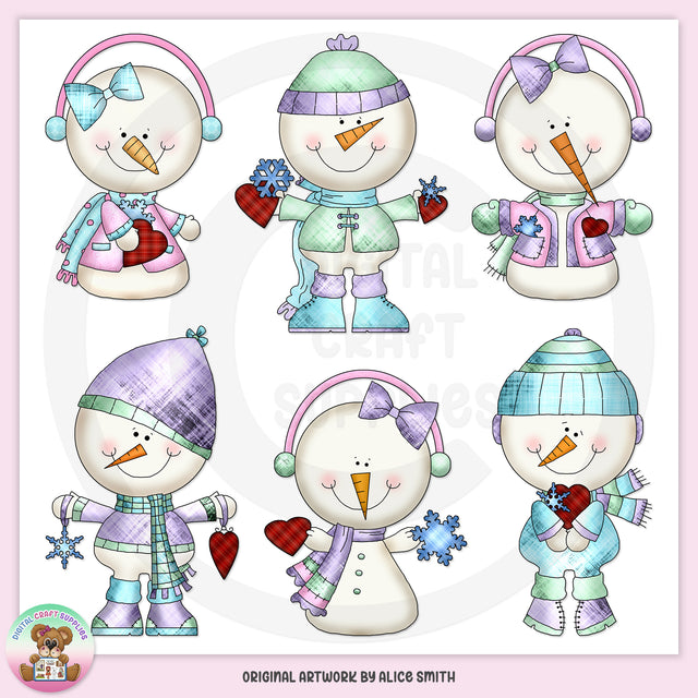 This collection includes six adorable snowmen and snow ladies, with winter coats, boots, hats, scarves, ear muffs, bows, frosty snowflakes, and Valentine hearts. This set contains 6 graphics.