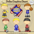 This collection includes five little boys, wearing colorful sports clothes, a football, football helmet, basketball, soccer ball, baseball, baseball bat, hockey stick, hockey puck, and one matching "Sports Fanatic" word art graphic. This set contains 6 graphics.