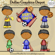 This collection includes five little boys, wearing colorful sports clothes, a football, football helmet, basketball, soccer ball, baseball, baseball bat, hockey stick, hockey puck, and one matching "Sports Fanatic" word art graphic. This set contains 6 graphics.
