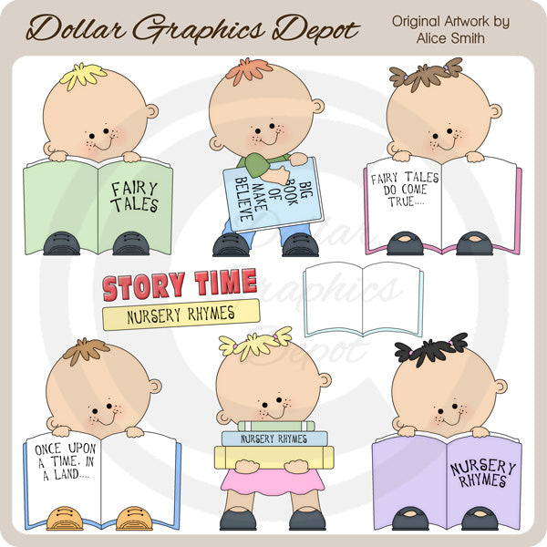 This one-of-a-kind collection is only available at Digital Craft Supplies. This set includes adorable little boys and girls with story books - Fairy Tales and Nursery Rhymes, one "Story Time - Nursery Rhymes" word art graphic, and one blank story book, for you to customize. This exclusive set contains 8 graphics.