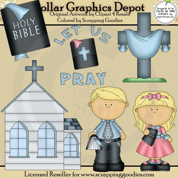 This collection includes a little boy with dress pants, a dress shirt, a tie, and a Bible, a little girl with a pretty dress, hair bow, and a Bible, a cross with a pretty draped cloth, a Holy Bible, a pretty church with cross on top, and one "Let Us Pray" word art graphic. Colors include: blue, black, gray, charcoal, pink, yellow, and green. This set contains 6 graphics.