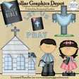 This collection includes a little boy with dress pants, a dress shirt, a tie, and a Bible, a little girl with a pretty dress, hair bow, and a Bible, a cross with a pretty draped cloth, a Holy Bible, a pretty church with cross on top, and one "Let Us Pray" word art graphic. Colors include: blue, black, gray, charcoal, pink, and green. This set contains 6 graphics.