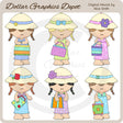 This collection includes six adorable little girls, wearing pretty polka dot sundresses, matching sun hats, and colorful tote bags. This set contains 6 graphics.