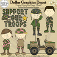 This collection includes two boys and two girls wearing military camouflage fatigues, helmets, and boots, in green, khaki, grey, brown, and pink, a military jeep, and one "Support Our Troops" word art graphic. This set contains 6 graphics.