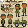 This collection includes two boys and two girls, wearing camouflage Army fatigues, helmets, and boots, in green and black, a military jeep, and one "Support Our Troops" word art graphic, with a red, white, and blue American flag fill, Army helmet, and a star. This set contains 6 graphics.