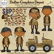 This collection includes two boys and two girls, wearing camouflage Marine fatigues, helmets, and boots, in brown, khaki, and black, a military jeep, and one "Support Our Troops" word art graphic, with a red, white, and blue American flag fill, Marine helmet, and a star. This set contains 6 graphics.