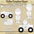 This collection includes two servicemen, wearing military fatigues, helmets, and boots, two military jeeps (one with a serviceman,) an American flag with "Thanks For Your Service" word art, and a stars and stripes word art graphic that reads: "We Salute You." This set contains 6 digital stamps.