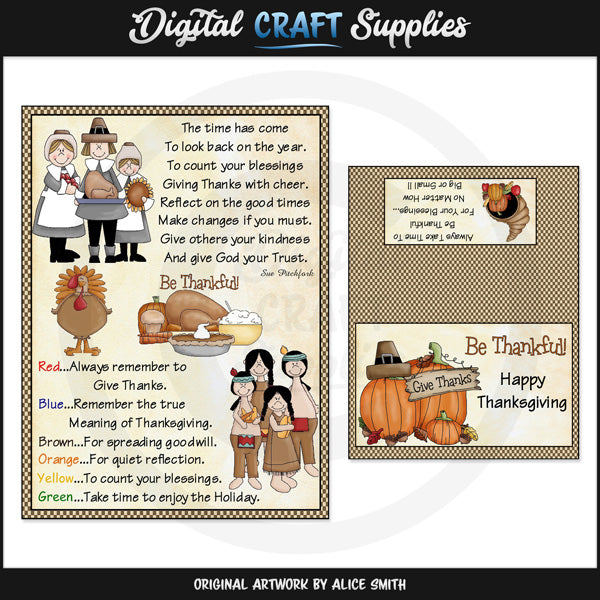 This one-of-a-kind collection is only available at Digital Craft Supplies. This collection includes one "Thanksgiving" M&M insert and one coordinating bag topper. The design includes gingham borders, "Be Thankful" word art, Thanksgiving fixings, pilgrims, Indians, a turkey, apples, a sunflower, fall pumpkins, colorful autumn leaves, a pilgrim hat, acorns, a "Give Thanks" wooden sign, a cornucopia, and a coordinating "Thanksgiving" poem (please see preview for wording). This exclusive set contains 2 individual printables and 1 "Ready To Print" page (not shown in preview).