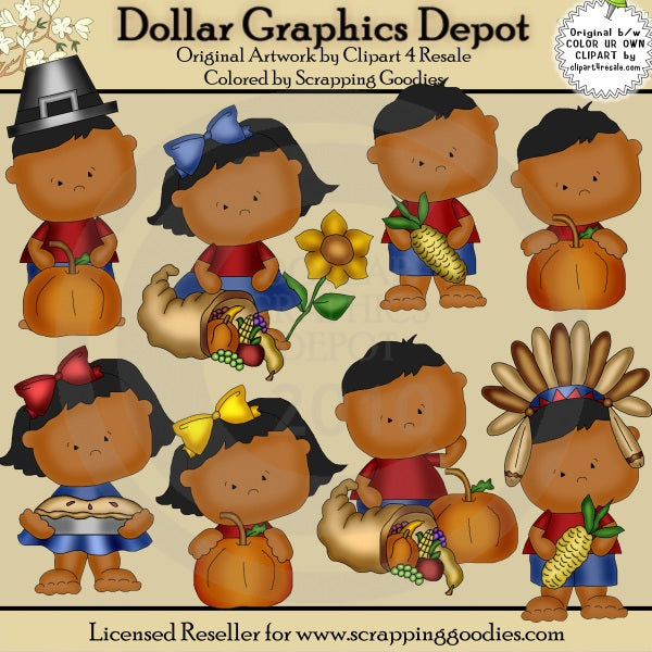 This collection includes four toddler boys wearing shorts and T-shirts, four toddler girls wearing pretty dresses and hair bows, a pilgrim hat, an Indian feather headdress, lots of fall pumpkins, a pretty yellow flower, cornucopias filled with autumn fruit, corn cobs, and a fresh baked pie. Colors include: red, blue, yellow, green, black, brown, silver, and pumpkin. This set contains 8 graphics.