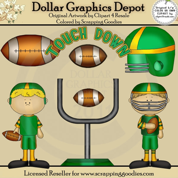 This collection includes two football players, with football uniforms, helmets, cleats, and footballs, a goal post with a football, a football helmet, a football, and one "Touch Down" word art graphic. Colors include: green, gold, black, charcoal, yellow, brown, tan, and white. This set contains 6 graphics.