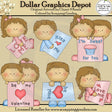 This collection includes four cute little boys and four pretty little girls, each holding a Valentine card - one with "Love Me" word art, one with little hearts and "Kiss Me" word art, one with a cupcake and "I'm Sweet For You" Word art, one with a heart and "Be My Valentine" word art, one with a heart and "Be Mine" word art, and one with little hearts and "Love Me" word art. Colors include: pastel blue, pink, red, brown, tan, and black. This set contains 6 graphics.