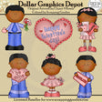 This collection includes a little boy wearing jeans, a dress shirt, and tie, with a bouquet of flowers and a little heart, a little girl wearing a pretty skirt, sweater, and headband, with a Valentine heart, a bouquet of flowers, a Valentine card in an envelope, and a box of chocolates, a little boy wearing jeans, a dress shirt, and tie, with a Valentine heart that reads "Be Mine," a little girl wearing a pretty dress and hair bow, with a little Valentine heart that reads "Love Me," a little boy wearing jeans, a dress shirt, and a bow tie, with a box of chocolates, and a pretty Valentine heart with with scalloped edges and word art that reads "Happy Valentine's Day." Colors include: pink, red, blue, green, tan, yellow, brown, and black. This set contains 6 graphics.
