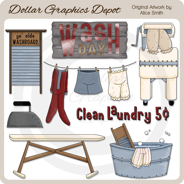This collection includes a washboard with "Ye' Olde Washboard" word art, a wooden sign with "Wash Day" word art, a wringer washer, clothes hanging on a clothesline, an iron, an ironing board, a wash tub with washboard, and one "Clean Laundry 5¢." This set contains 8 graphics.