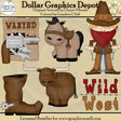 This collection includes a little boy with a cowboy hat, cowboy boots with spurs, blue jeans, leather chaps, leather coat, a bandana, and two guns, a long horned bull, a horse with leather reigns and saddle, a "Wanted - Bank Robber" sign, with a gun and sheriff badge, a leather cowboy boot with spurs, and one "Wild West" word art graphic. This set contains 6 graphics.