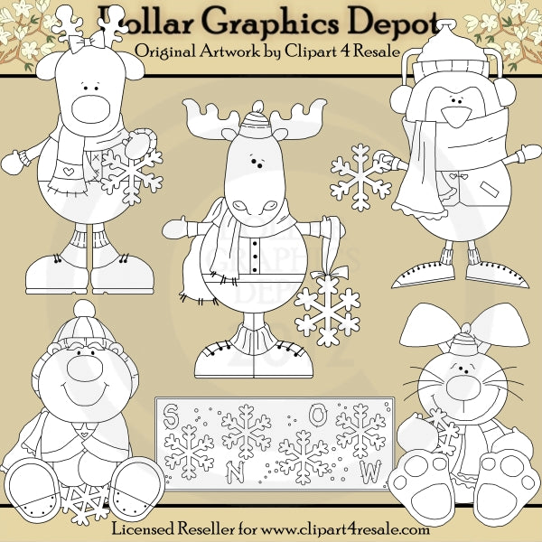 This collection includes a reindeer, moose, penguin, bear, and bunny, with winter coats, hats, scarves, ear muffs, mittens, and little snowflakes, and one winter "Snow" word art graphic. This set contains 6 digital stamps.