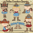 This collection includes six adorable little cowgirls, wearing pretty denim and polka dot outfits, cowgirl boots, cowgirl hats, a lasso rope, "giddy-up" horses, and one "Cowgirl" word art graphic. Colors include: brown, blue, red, white, tan, yellow, beige, and black. This set contains 6 graphics.