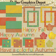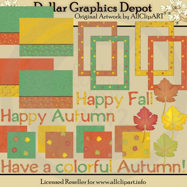 This collection includes four 5"x7" card fronts in orange, green, gold, and brown, with pretty fall leaves, four 5"x7" frames in orange, green, gold, and brown, with pretty fall leaves, eight 8"x8" background papers in orange, green, gold, brown, orange with fall leaves, green with fall leaves, gold with fall leaves, and brown with fall leaves, four colorful autumn leaves, and three autumn word art graphics: "Happy Fall," "Happy Autumn," and "Have A Colorful Autumn." This set contains 23 pieces.
