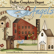 This collection includes a red saltbox house with lit candles in the windows and "Est. 1886" word art, a wooden birdhouse with berry vines growing up the post, a patch of grass with a blue bird, birdseeds, a bumble bee, sunflowers, and little birds flying off in the distance, a patch of grass with a wooden birdhouse, a red flower, and clay flowerpots, a pretty church with lit candles in the windows and "God's House" word art, an angel flying over with a string of gold stars, and one "Angels Over Us" word art graphic. This set contains 7 graphics.