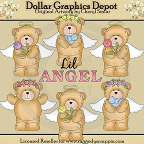 This collection includes six adorable little teddy bears, pretty floral headbands, golden halos, beautiful angel wings, pretty roses, little blue birds, and one "Lil Angels" word art graphic. This set contains 7 graphics.