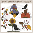 This collection includes an autumn crow with a patchwork hat and and gold star, a patch of grass, tree stump, fall pumpkins, and a black crow, a patch of grass with a pretty sunflower and a black crow, autumn leaves and berries tied in a pretty bow, and one leaf and berry scroll border. This set contains 5 graphics.