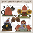 This collection includes a patch of grass with a black cat and a pumpkin, a patch of grass with sunflowers, a brick pillar, and a pumpkin, a black crow with a patchwork hat and a wooden sign that reads: "Happy Fall," a patch of grass with two pumpkins and a little girl holding a sunflower, and autumn acorns. This set contains 5 graphics.