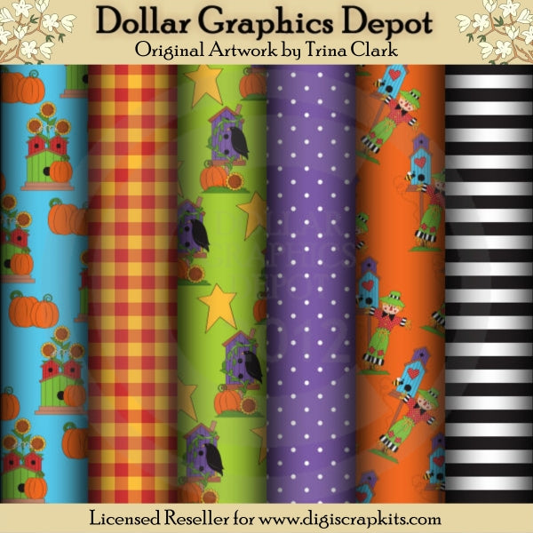 This collection includes six 12" x 12" Autumn Birdhouse scrap papers. Patterns include: birdhouses, sunflowers, pumpkins, crows, stars, scarecrows, plaid, polka dot, and striped patterns. PLEASE NOTE: This set coordinates with the "Autumn Birdhouses" graphic collection. This set contains 6 scrapbook papers.