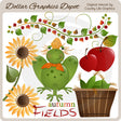 This collection includes a cute little spotted frog with an orange bow and straw hat, a basket filled with corn, red apples, a pretty sunflower, a sunflower face, a beautiful berry vine, and one "Autumn Fileds" word art graphic. This set contains 7 graphics.