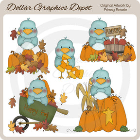 This collection includes adorable fall birds with colorful autumn leaves, fall pumpkins, daisies, , a wooden barrel of apples with a "Pumpkins" sign, corn stalks, candy corns, and a wheel barrow with "Happy Fall" word art. This set contains 5 graphics.
