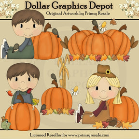This collection includes adorable, little autumn kids, colorful fall leaves, pumpkins, black crows, cattails, daisies, cornstalks, an acorn, and a cute little frog. This set contains 5 graphics.
