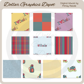 This collection includes ten wedding "Bookworm Boys" background tiles with striped, gingham, checkered, antiqued, backpack with books and bookworm, stack of books, reading glasses, and bookworm, "#1 Reader" word art, and "I Love Books" word art patterns. PLEASE NOTE: This set coordinates with the "Bookworm Boys - Clip Art" collection. This set contains 10 background tile graphics.