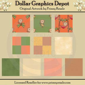This collection includes ten "Monkey Fun" background tiles - one orange with monkeys, palm tree branches, and coconuts with straws, one green with monkeys holding bananas, one orange with monkeys relaxing in a hammock in between two palm trees, one green and orange checkered, one yellow and brown checkered, one cream with marble effect, one green with marble effect, one cream with small checkers, one orange with small checkers, and one brown pattern. PLEASE NOTE: This set coordinates with the "Monkey Fun" graphic collection. This set contains 10 background tile graphics.