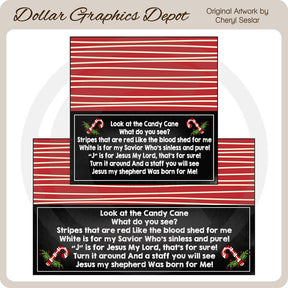 This collection includes one 6.5" x 4" (6.5" x 2" when folded), and one 4" x 4" (4" x 2" when folded), Candy Cane Legend chalkboard bag toppers, with stripes, candy canes, and chalkboard text that reads: "Look At The Candy Cane - What Do You See? Stripes That Are Red Like The Blood Shed For Me - White Is For My Savior Who’s Sinless And Pure! “J” Is For Jesus My Lord, That’s For Sure! Turn It Around And A Staff You Will See - Jesus My Shepherd Was Born For Me!" This set contains 2 bag toppers.