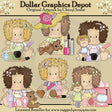 This collection includes six adorable little girls, wearing pretty gingham, patchwork, and polka dot jumper dresses, matching hair bows, and a pretty floral hat, cute little dolls, stuffed teddy bears, a boutique shopping bag, perfume bottles, makeup brushes, a powder compact, an eye shadow kit, nail polish, lipstick, blush, mascara, and a mirrored compact. This set contains 6 graphics.