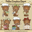 This collection includes six adorable little teddy bears, wearing chef hats, aprons, and pretty hair bows, chocolate chip cookies, mixing bowls, a bottle of vanilla extract, an egg, a wooden spoon, rolling pins, measuring spoons, a wooden chair, a sugar bowl, and a baking sheet with chocolate chip cookies. This set contains 6 graphics.