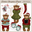 This collection includes a little bear with a Christmas outfit, Santa hat, scarf, and Christmas caroling songbook, a little bear with a Christmas outfit, winter hat, and a cute little teddy bear, a little bear angel with a pretty Christmas dress, scarf, halo, and pretty angel wings, winter mittens with little snowflakes, a Christmas bell with red ribbon, a velvet Christmas stocking, and one snowflake background. This set contains 7 graphics.