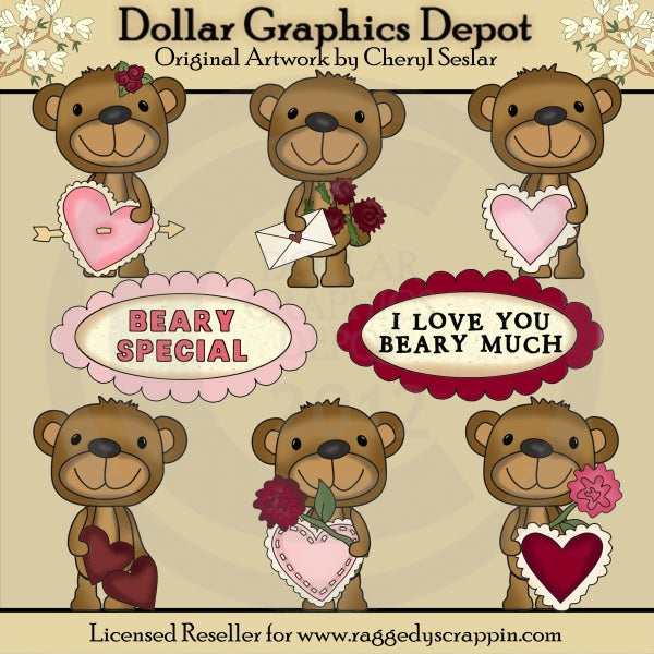 This collection includes six adorable Valentine bears, pretty pink and red hearts with scalloped edges, a pink heart with little stitches, a pink heart with an arrow through it, red roses, a pink rose, a Valentine card in an envelope, and two scalloped signs that read: "Beary Special" and "I Love You Beary Much." This set contains 8 graphics.